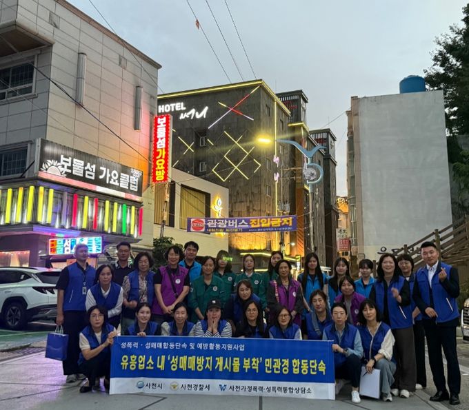 [경남도민뉴스=변정형 기자] 사천시는 ‘2025년 성매매 추방주간’을 맞이해 지난 22일 민·관·경 합동으로 삼천포 일대 유흥업소 60여 개소를 대상으로 ‘유흥업소 성매매 방지 등 게시물 부착여부’를 집중적으로 점검했다.