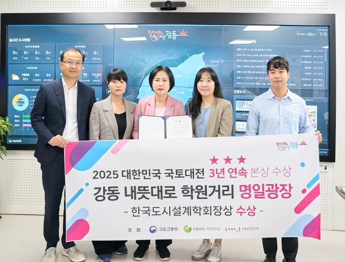 [경남도민뉴스=김완호 기자] 강동구는 지난 18일 ‘2025 대한민국 국토대전’에서 ‘강동 내뜻대로 학원가 명일광장 조성사업’으로 한국도시설계학회장상을 수상했다고 24일 밝혔다.