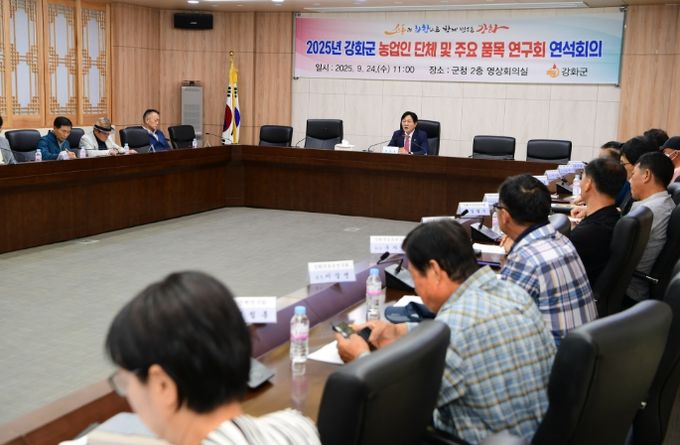 [경남도민뉴스=김용욱 기자] 강화군은 지난 24일 관내 농업인 단체장과 주요 품목 연구회 대표들과 함께 연석회의를 열고, 가을철 수확기를 맞은 농산물의 고품질 유지와 농업 발전 방안을 모색했다.