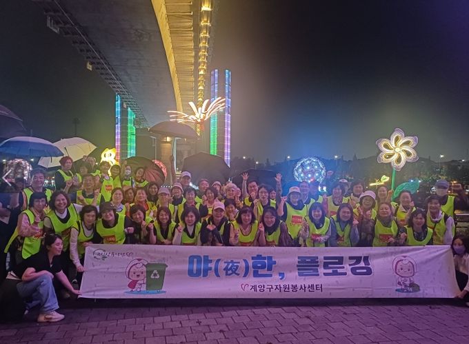 [경남도민뉴스=김용욱 기자] 인천 계양구자원봉사센터는 지난 24일 저녁, ‘계양아라온 아트웨이(빛의 거리 3단계)’와 ‘가을꽃 국화축제’가 열리는 현장에서 자원봉사자 74명과 함께 ‘야(夜)한 플로깅’ 봉사활동을 진행했다.