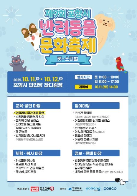 [경남도민뉴스=장강동 기자] 포항시는 오는 10월 11일부터 12일까지 만인당 잔디광장에서 ‘제9회 포항시 반려동물 문화축제’를 개최한다.