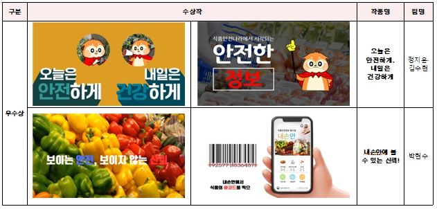 대상 수상작인 ‘밥상 히어로즈’ 팀의 ‘우리 가족의 안전한 식탁’과 최우수상 수상작인 강동우’님의 ‘국민의 식탁을 설계하는 곳, 식품안전나라’는 식품 알레르기와 같은 일상 속 식품안전에 관한 고민을 식품안전나라의 식품·수입식품·건강기능식품 정보, 우리동네 정보 및 공공데이터 활용 기능을 통해 해결하는 이야기를 담고 있다.