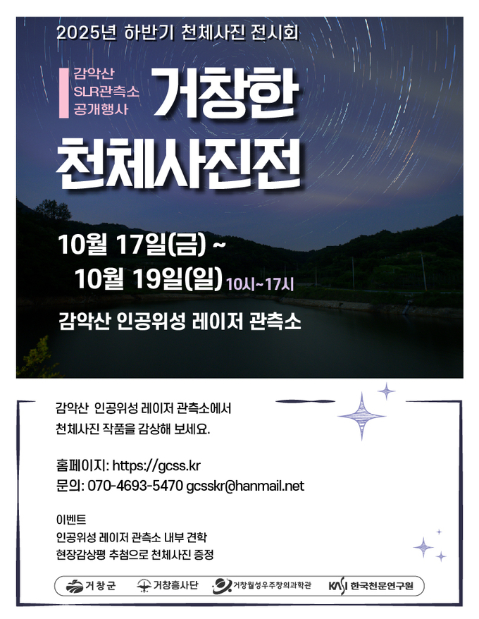 강용범 거창월성우주창의과학관장은 “은하수, 심우주 천체 등을 촬영한 '천체사진촬영강좌'에서 입상한 50여 점의 작품을 전시해 거창군의 다양하고 멋진 밤하늘을 선보일 예정”이라며, “많이 방문해 인공위성 레이저 관측소 내부 시설을 견학하고 거창군의 멋진 우주도 함께 감상하시길 바란다”고 전했다.
