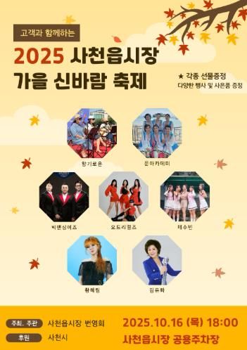 [경남도민뉴스=변정형 기자] 사천시는 오는 16일 사천읍시장 공영주차장(특설무대)에서 ‘제15회 사천읍시장 가을 신바람 축제’를 개최한다고 14일 밝혔다.
