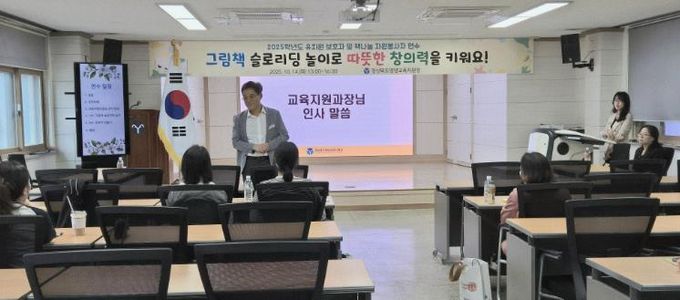 [경남도민뉴스=장강동 기자] 경상북도영양교육지원청은 2025년 10월 14일 영양교육지원청 대회의실에서 ‘그림책 슬로리딩 놀이로 따뜻한 창의력을 키워요’라는 주제로 관내 유치원, 어린이집 및 초등 1, 2학년 학생과 학부모를 대상으로 2025 유치원·초등 저학년 보호자 및 책나눔 자원봉사자 연수를 개최했다.