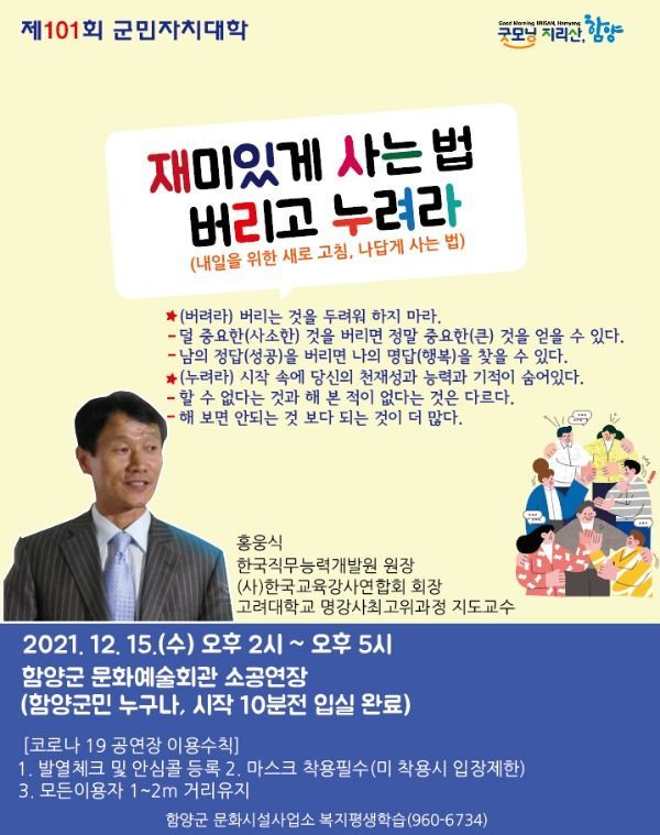 이번 제101회 군민자치대학은 코로나19의 장기화로 어려운 모두에게 긍정적인 삶을 살아가는 해법을 제시하기 위해 홍웅식 한국직무능력개발원 원장이 ‘재미있게 사는 법, 버리고 누려라(내일을 위한 새로 고침, 나답게 사는 법)’이라는 주제로 강연을 진행한다.
