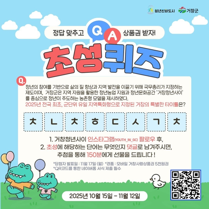 참여 방법은 간단하다. 우선 거창군 청년정책 공식 인스타그램 계정(@Youth_in_gc)을 팔로우한 뒤, 이벤트 기간 중 게시되는 초성 퀴즈 게시물에 정답 댓글을 남기고, 게시물 내 안내된 네이버폼 링크를 통해 이름과 연락처 등 인적 사항을 제출하면 된다.