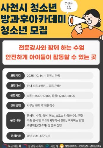 [경남도민뉴스=변정형 기자] 사천시 복지·청소년재단 소속 청소년방과후아카데미는 청소년의 안전한 방과 후 돌봄과 균형잡힌 성장을 지원하기 위해 신규 청소년을 모집한다고 15일 밝혔다.