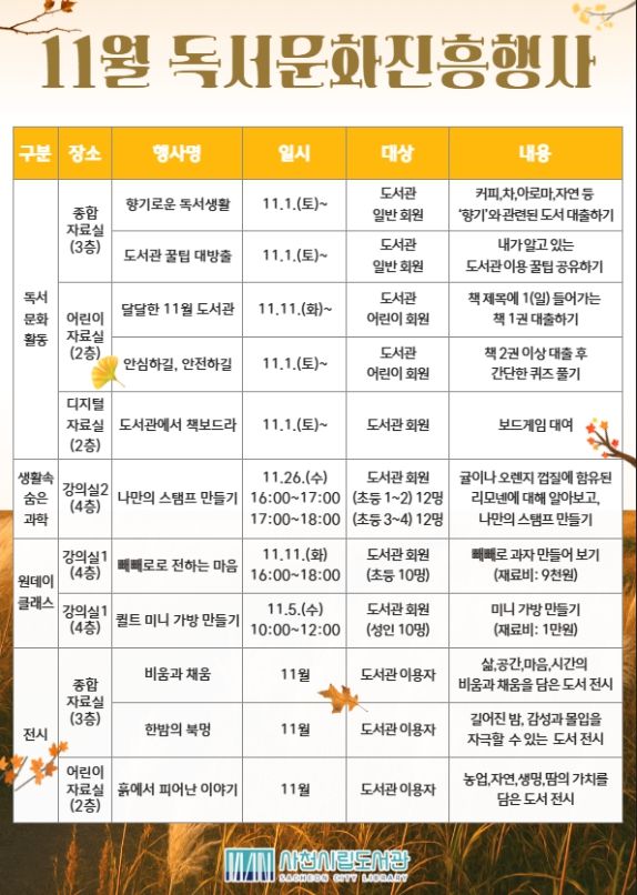 [경남도민뉴스=변정형 기자] 사천시는 사천시립도서관에서 11월 한 달 동안 책과 함께 여유로운 시간을 보내며 감성을 채울 수 있는 다양한 독서문화행사와 체험 프로그램을 운영한다고 17일 밝혔다.