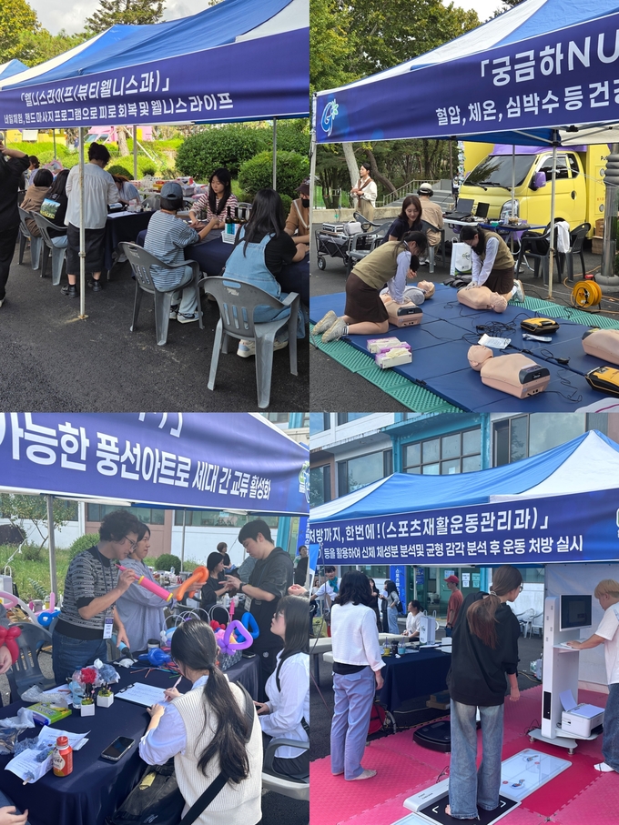 각 학과는 전공특성을 살린 체험 부스를 운영해 지역민과 재학생들에게 다양한 항노화 프로그램을 제공했다. 간호학과는 혈압, 심박수 등 건강지표 측정과 심폐소생술 실습을 통해 응급상황에 대한 역량을 높였으며, 뷰티웰니스과는 네일아트 및 핸드 마사지 프로그램으로 웰니스 라이프를 체험할 수 있도록 했다. 스포츠재활운동관리과는 인바디, 스트레스 진단기 등을 활용해 신체 분석 후 맞춤형 운동 처방을 진행 했고, 사회복지보육학부는 스칸디아모스 공예와 풍선아트 프로그램으로 가족 단위 참여자들의 심리적 안정과 세대 간 소통을 도왔다.