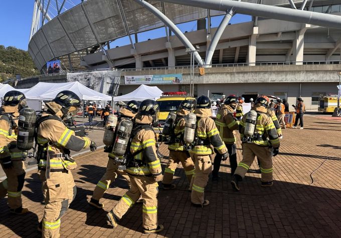 올해 훈련은 진주종합경기장에서 경기장 붕괴 및 화재로 인한 인파사고를 재난유형으로 선정해 진행됐다. 진주종합경기장 서북쪽에서 가스 누출로 화재가 발생하고 가스 저장탱크가 폭발해 경기장 일부가 붕괴돼 대피 중 다중밀집으로 인파사고가 발생한 상황을 설정했다.