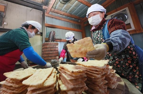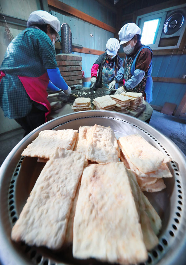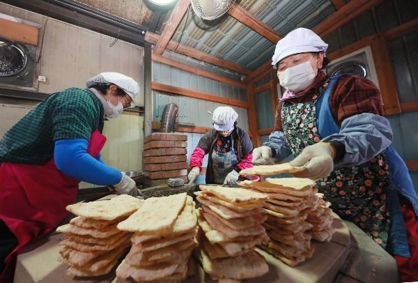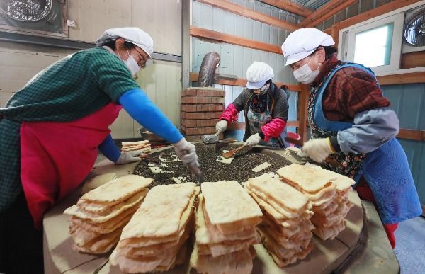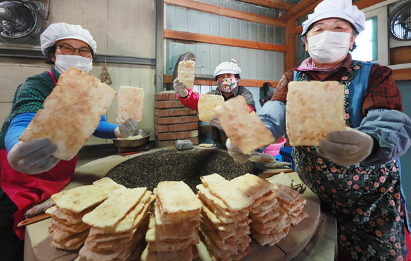 [경남도민뉴스] 13일 경남 함양군 지곡면 개평한옥마을 한과작업장에서 마을 할머니들이 뜨거운 장작불에 구워 낸 자갈한과를 만들고 있다.