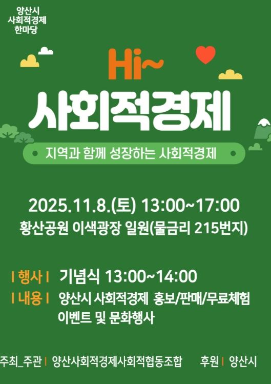 [경남도민뉴스=최미정 기자] 양산시는 오는 8일 오후 1시부터 오후 5시까지 황산공원 이색광장 일원에서 2025년 사회적경제 한마당(부제‘Hi~ 사회적경제’) 행사를 개최한다.