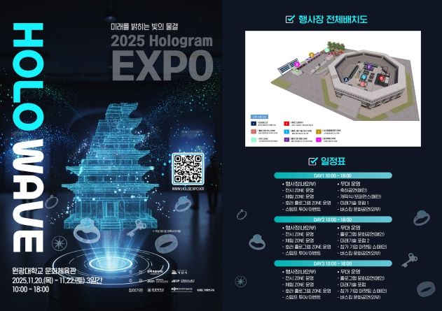 [경남도민뉴스=최인태 기자] (재)전북특별자치도 콘텐츠융합진흥원(원장 김성규)은 ‘2025 홀로그램 엑스포 HOLO WAVE’가 오는 11월 20일부터 22일까지 3일간, 오전 10시부터 오후 6시까지 익산 원광대학교 문화체육관에서 개최된다고 밝혔다.