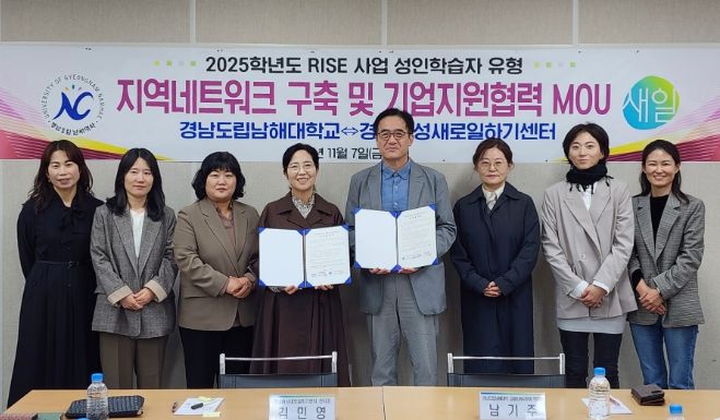 협약에 따라 두 기관은 ▲경남 지역민 및 재취업 희망 여성, 남해대학 재학생을 위한 평생학습교육 프로그램 기획 및 운영을 위한 정보교류 ▲상호 네트워크 구죽을 통한 교육 콘텐츠 개발 및 인적 자원 활용 협력 ▲성인학습자를 위한 취·창업 기관 확대 및 발굴 협력 등 다양한 공동사업을 추진할 계획이다.