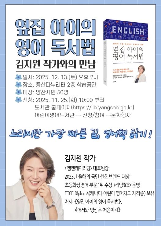 [경남도민뉴스=최미정 기자] 양산시립 어린이영어도서관은 오는 12월 13일 오후 2시 『옆집 아이의 영어 독서법』의 저자 김지원 작가를 초청하여 작가와의 만남을 운영한다.