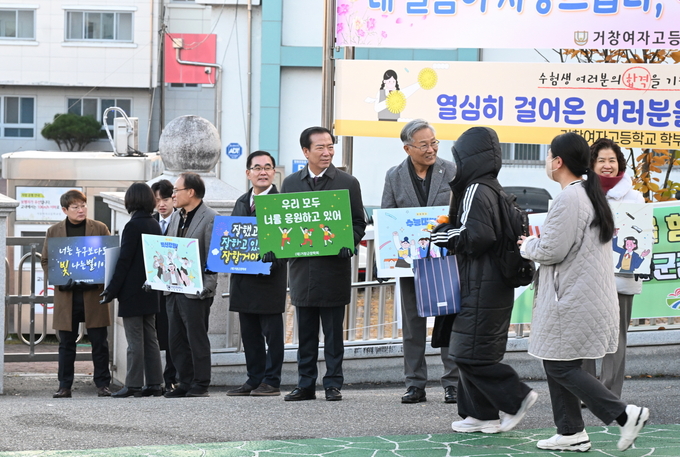 이날 현장에는 구인모 (재)거창군장학회 이사장을 비롯해 김재구 경남도립거창대학 총장, 거창군 인구교육과 직원, 청소년수련관, 청소년문화의집, YMCA 관계자 등이 함께 해 수험생들을 응원했다.