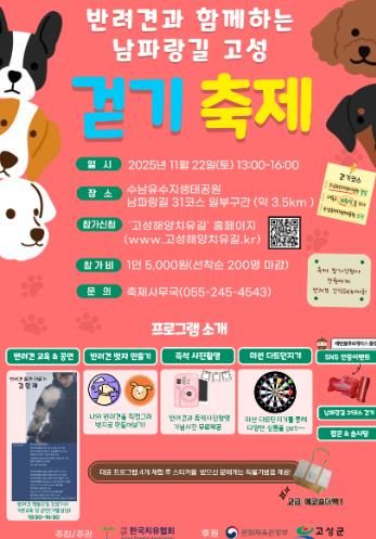 [경남도민뉴스=김태수 기자] 고성군은 오는 11월 22일 수남유수지 생태공원과 대독누리길 일원에서 ‘반려견과 함께하는 남파랑길 고성 걷기축제’를 개최한다고 밝혔다.