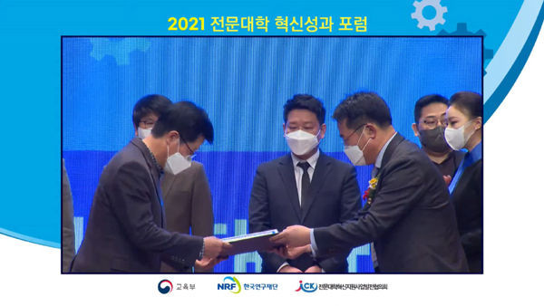 이 표창은 전문대학 혁신지원사업의 성공적인 추진과 안정적 정착에 기여 및 운영·성과 확산에 기여도가 큰 유공자에게 주어지는 표창으로, 14일 대구 인터불고 호텔에서 열린 ‘2021년 전문대학 혁신성과 포럼’에서 부총리 겸 교육부장관을 대신하여 교육부 이상우 전문대학지원과장이 표창을 수여했다.