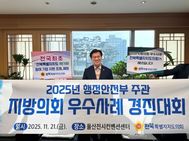 [경남도민뉴스=최인태 기자] 전북특별자치도의회가 지난 21일 울산전시컨벤션센터에서 열린 행정안전부 주관 ‘2025년 지방의회 우수사례 경진대회’에서 본선에 진출해 수상하는 영예를 안았다.