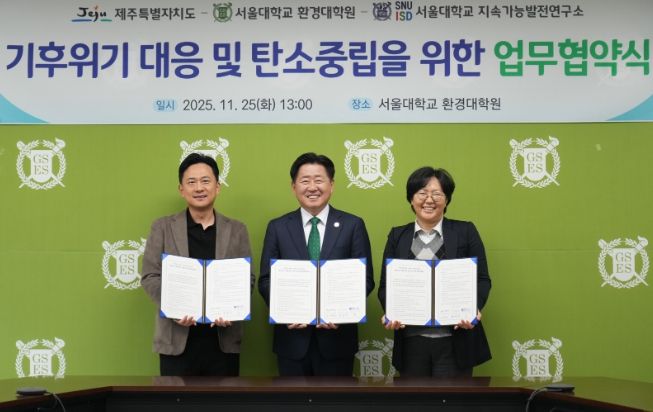 제주도는 25일 오전 서울대학교에서 서울대 환경대학원, 지속가능발전연구소와 ‘기후위기 대응 및 탄소중립을 위한 지속가능 정책 연구·자문 및 교류 업무협약’을 체결했다.