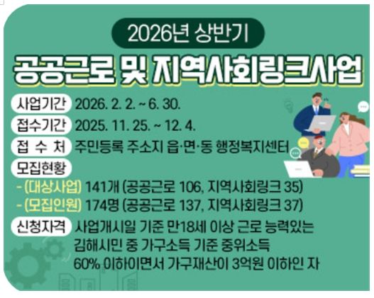 [경남도민뉴스=최미정 기자] 김해시는 25일부터 다음 달 4일까지 ‘2026년 상반기 공공근로 및 지역사회링크사업’ 참여자를 모집한다.