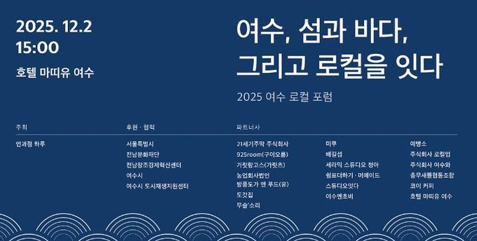 [경남도민뉴스=최인태 기자] 여수시는 ‘연과점 하루’가 오는 12월 2일 오후 3시 마띠유호텔에서 ‘여수, 섬과 바다, 그리고 로컬을 잇다 - 2025 여수 로컬 포럼’을 개최한다고 밝혔다.