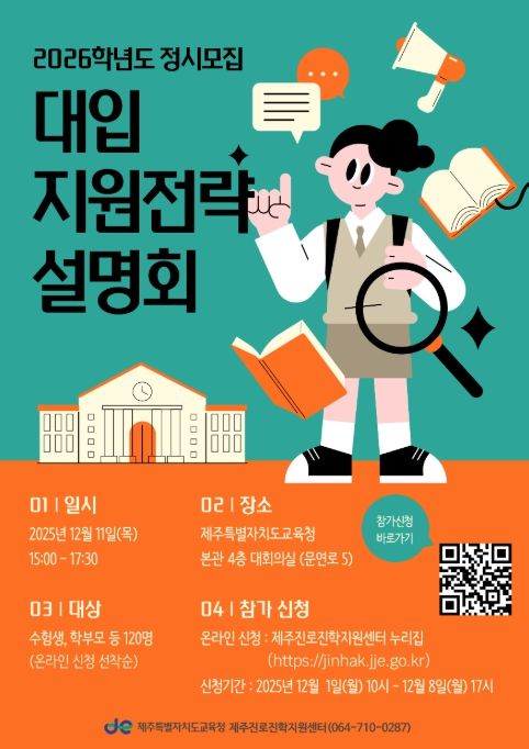 [경남도민뉴스=하형수 기자] 제주특별자치도교육청은 12월 11일 오후 3시부터 본관 4층 대회의실에서 ‘2026학년도 대입 정시모집 지원전략 설명회’를 개최한다.