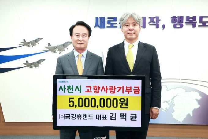 [경남도민뉴스=변정형 기자] 사천시는 조경 시설물 제조·설치업체인 (주)금강휴랜드의 김택균 대표가 고향사랑기부금 500만 원을 기부하며, 사천 지역사회 발전에 뜻깊은 나눔을 실천했다고 28일 밝혔다.