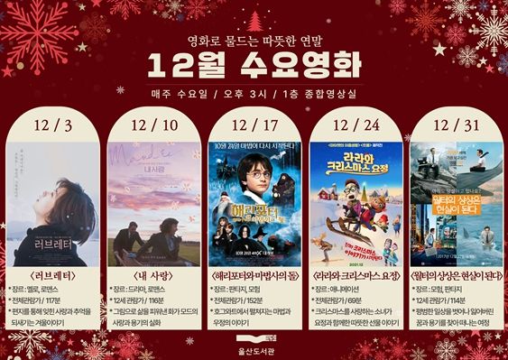 이어 ▲12월 17일에는 '해리포터와 마법사의 돌' ▲12월 24일 만화영화(애니메이션) '라라와 크리스마스 요정' ▲올해 마지막 날인 12월 31일에는 '월터의 상상은 현실이 된다'가 상영된다.