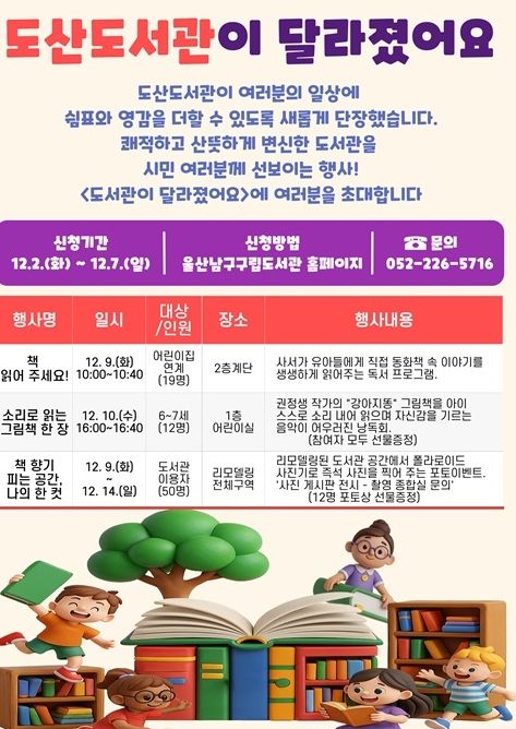 [경남도민뉴스=최재경 기자] 울산 남구 도산도서관은 부분 리모델링을 통해 한층 더 쾌적하고 편안한 독서환경을 조성하고 시민들이 책과 문화를 함께 즐길 수 있는 열린 공간으로 거듭나 이를 기념하는 ‘도산도서관이 달라졌어요’ 행사를 9일부터 14일까지 운영한다고 밝혔다.