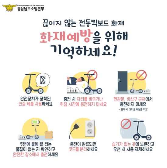 [경남도민뉴스=구인애 기자] 경상남도 소방본부는 최근 주거시설 내부에서 전동킥보드를 현관에서 충전하던 중 화재가 발생했다면서, 도민들에게 전동킥보드 사용 및 충전 시 각별한 주의를 당부했다.
