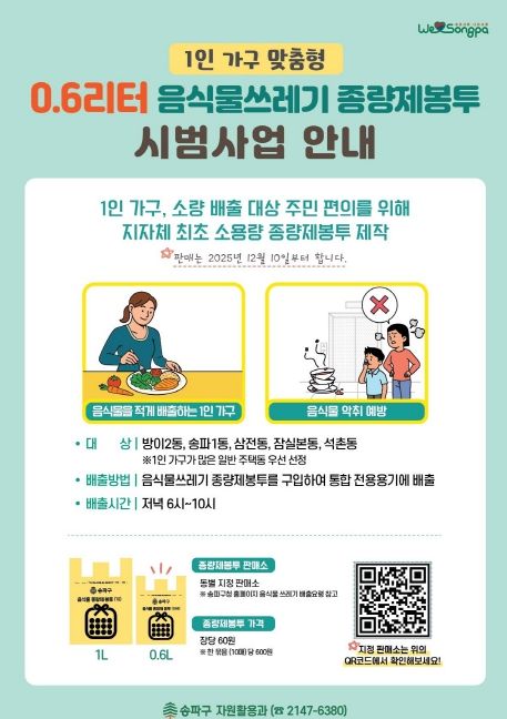 [경남도민뉴스=김완호 기자] 서울 송파구가 전국 지방자치단체 최초로 1인 가구에 최적화된 0.6ℓ 규격의 음식물쓰레기 종량제봉투를 오는 10일부터 시범 도입해 운영한다고 알렸다.