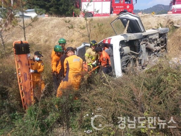 거창소방서는 16일 오후 12시반경 거창군 남하면 둔마리 구)둔마초등학교옆 국도에서 승용차량이 도로 2m아래로 전복되는 교통사고가 발생했다.