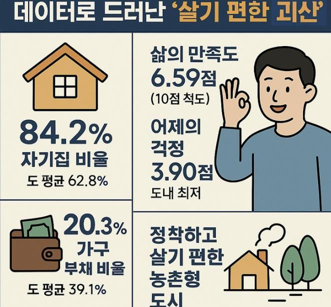 이는 주거 안정성·부채 구조·정서적 안정감이 서로 맞물리며 괴산만의 느리지만 평온한 생활 방식이 걱정은 가장 적고 만족과 행복이 가장 높은 지역을 만든 것으로 해석할 수 있다.