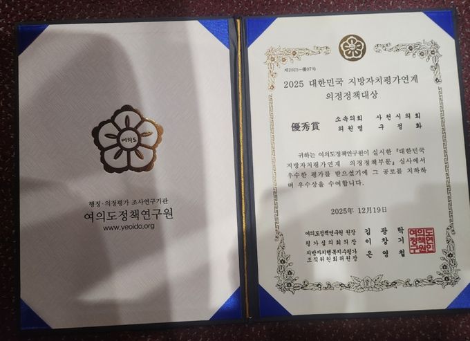 [경남도민뉴스=변정형 기자] 사천시의회 구정화 의원이 12월 19일, 국회의사당에서 열린 여의도정책연구원 주최 ‘2025 지방자치평가 의정정책 우수상’을 수상했다.