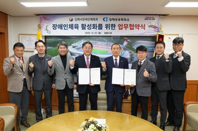 [경남도민뉴스=최미정 기자] 김해시장애인체육회는 22일 오전 10시 김해시청에서 김해상공회의소(회장 노은식)와 장애인체육 활성화를 위한 업무협약을 체결했다.