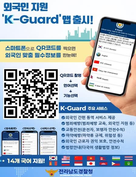 전남경찰청 범죄예방대응과는『보이스피싱 예방 벨소리』 앱에 이어 외국인 지원 앱『K-Guard』를 개발하는 등 도민의 안전과 평온한 일상을 지키기 위한 노력을 적극 추진하고 있다.