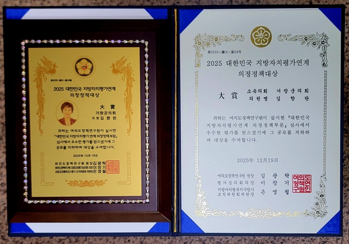 [경남도민뉴스=백형찬 기자] 거창군의회 김향란 의원(국민의힘, 읍 가선거구)은 지난 12월 19일 서울 여의도 국회의원회관 대회의실에서 열린‘2025 대한민국 지방자치평가연계 의정정책대상’시상식에서 기초의회 부문 대상을 지난해 이어 연속으로 수상하는 쾌거를 이끌어 내었다.