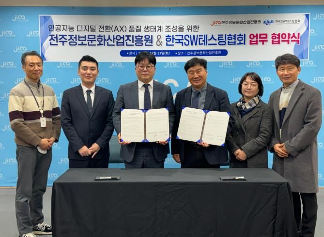 [경남도민뉴스=최인태 기자] 전주시 출연기관인 (재)전주정보문화산업진흥원은 23일 진흥원 멀티미디어기술지원센터 1층 세미나실에서 사단법인 한국소프트웨어테스팅협회와 ‘인공지능 디지털 전환(AX) 품질 생태계 조성’을 위한 업무협약을 체결했다.