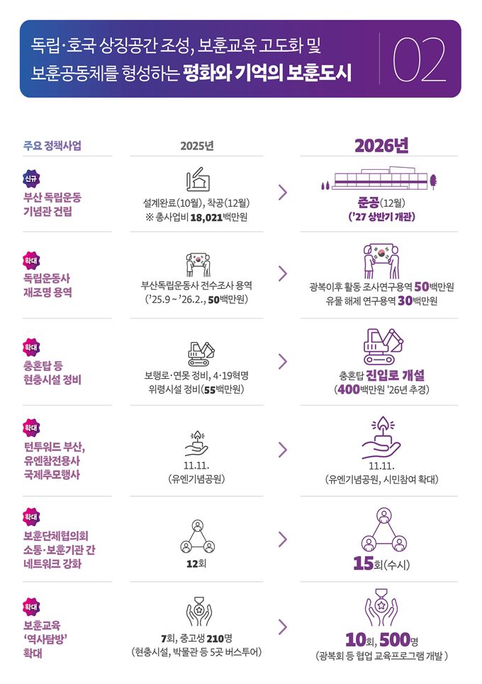 [보훈과 평화의 가치 기억 정책]을 통해 부산의 독립·호국 정신을 계승하고 국제 평화도시로서의 위상을 높인다.
