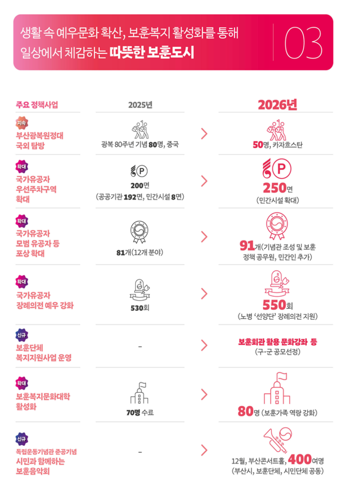 독립유공자 후손과 시민이 함께하는 부산광복원정대를 통해 참여형 보훈을 일상으로 확산하고, 국가유공자 우선주차구역을 늘려 생활 속 예우를 정착시키며, 국가유공자 장례 시 의전 지원을 확대해 국가를 위해 희생한 영웅들의 마지막 순간까지 예우를 다할 계획이다.