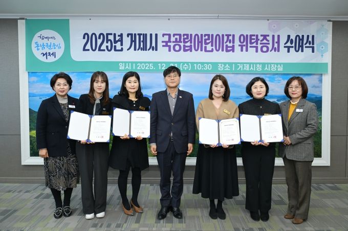 [경남도민뉴스=김부경 기자] 거제시는 12월 31일, 시장실에서 국공립어린이집 수탁자로 선정된 어린이집에 위탁계약증서를 수여했다.