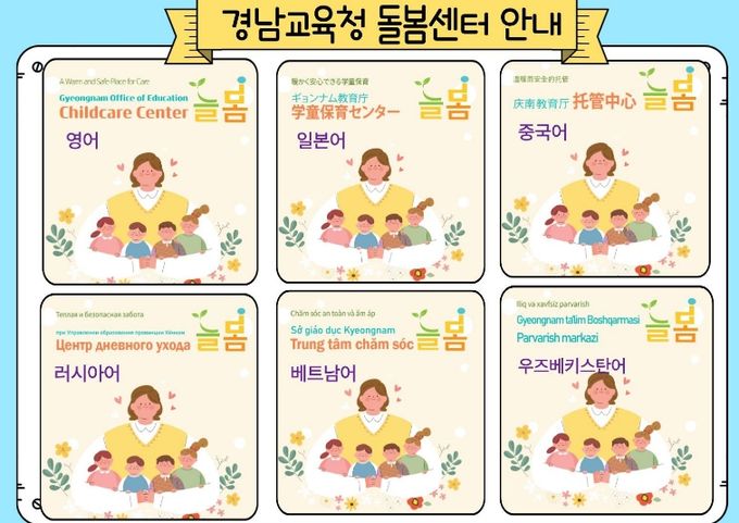[경남도민뉴스=구인애 기자] 경상남도교육청은 다문화 가정과 외국인 학부모가 돌봄 서비스를 쉽게 이해할 수 있도록 경남교육청 돌봄센터 ‘늘봄’ 안내자료를 6개 국어로 제작해 배포했다. 지원 언어는 영어, 일본어, 중국어, 베트남어, 러시아어, 우즈베키스탄어이다.