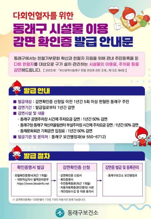 대상자는 대한적십자사 혈액관리본부 누리집에서 발급되는 헌혈 확인 증명서와 주민등록등본, 자동차등록증 등 관련 서류를 지참해 동래구 보건소를 방문하면 시설물 이용 감면 확인증을 발급받을 수 있다.