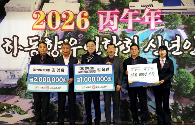 [경남도민뉴스=김태수 기자] 하동군은 지난 9일 개최된 ‘전국하동향우연합회 2026년 신년인사회’에서 김영목 마산향우회장과 김옥찬 대한경제신문 부산·경남 지사장이 각각 고향사랑기부금 200만 원, 100만 원을 전달했다고 밝혔다.