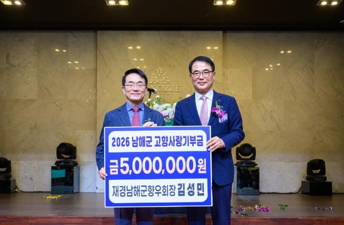 [경남도민뉴스=김부경 기자] 재경남해군향우회 김성민 회장이 지난 6일 서울에서 열린 ‘2026년 재경향우회 신년하례회’에서 남해군의 발전을 위해 고향사랑기부금 500만 원을 기탁했다.