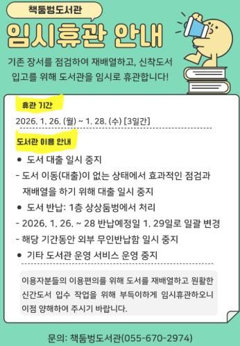 [경남도민뉴스=김태수 기자] 고성군이 운영하는 책둠벙도서관은 신규 장서 확충과 기존 장서 정비를 위해 2026년 1월 26일부터 28일까지 3일간 임시 휴관한다.