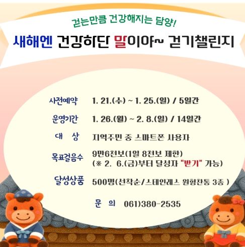 [경남도민뉴스=최인태 기자] 담양군은 2026년 새해를 맞아 오는 1월 26일부터 2월 8일까지 온라인 걷기 챌린지 ‘새해엔 건강하단 말이야’를 운영한다고 밝혔다.