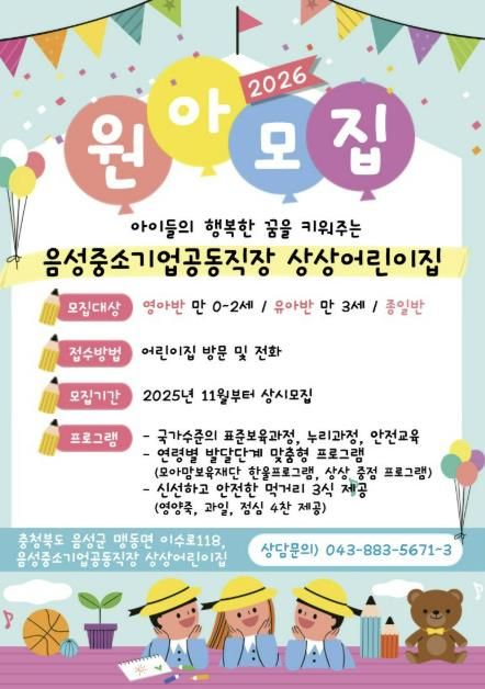 [경남도민뉴스=박만수 기자] 음성군은 중소기업 근로자의 보육환경 개선과 일·가정 양립 문화 확산을 위해 운영 중인 중소기업 공동직장어린이집 ‘상상어린이집’의 원아를 모집한다.